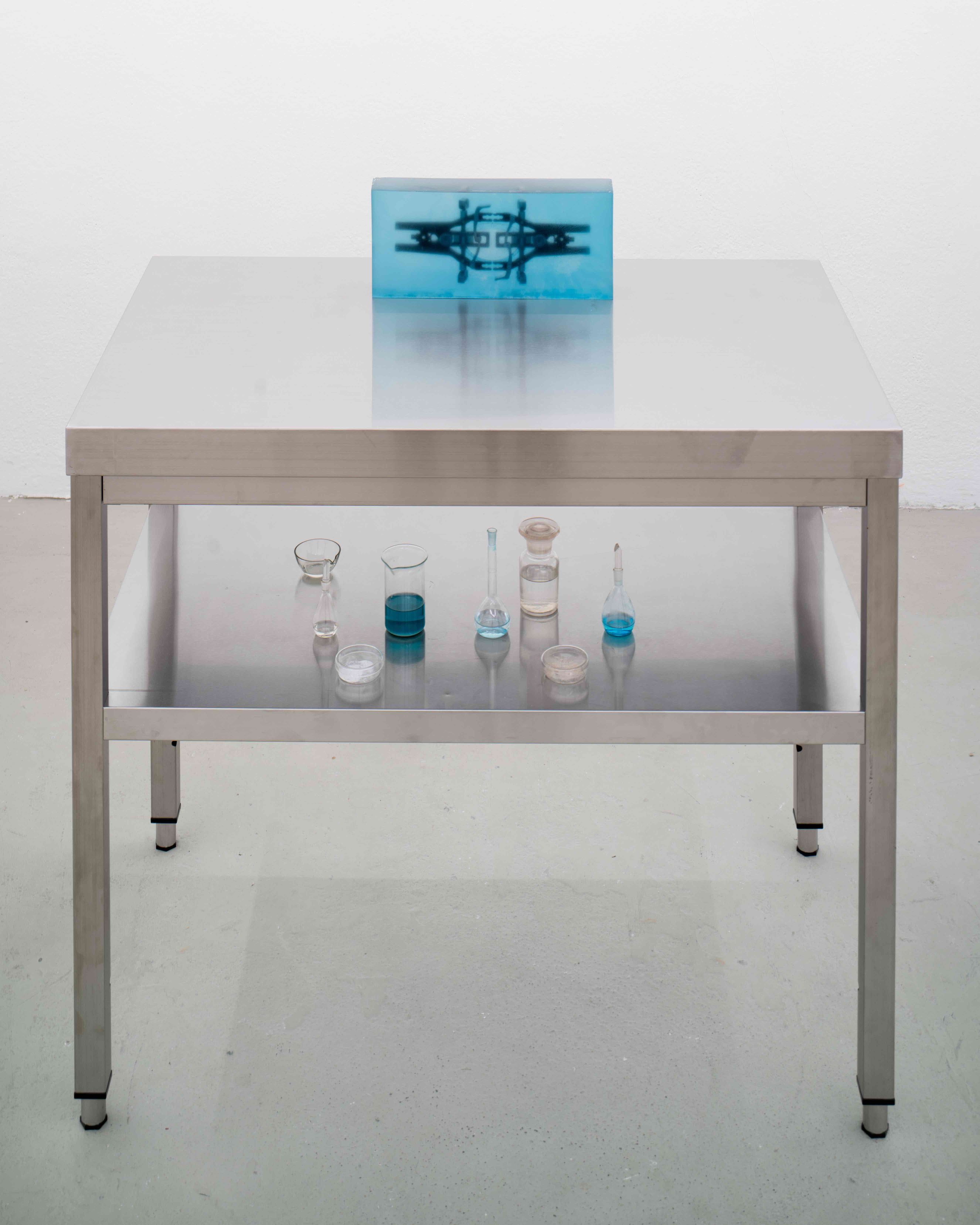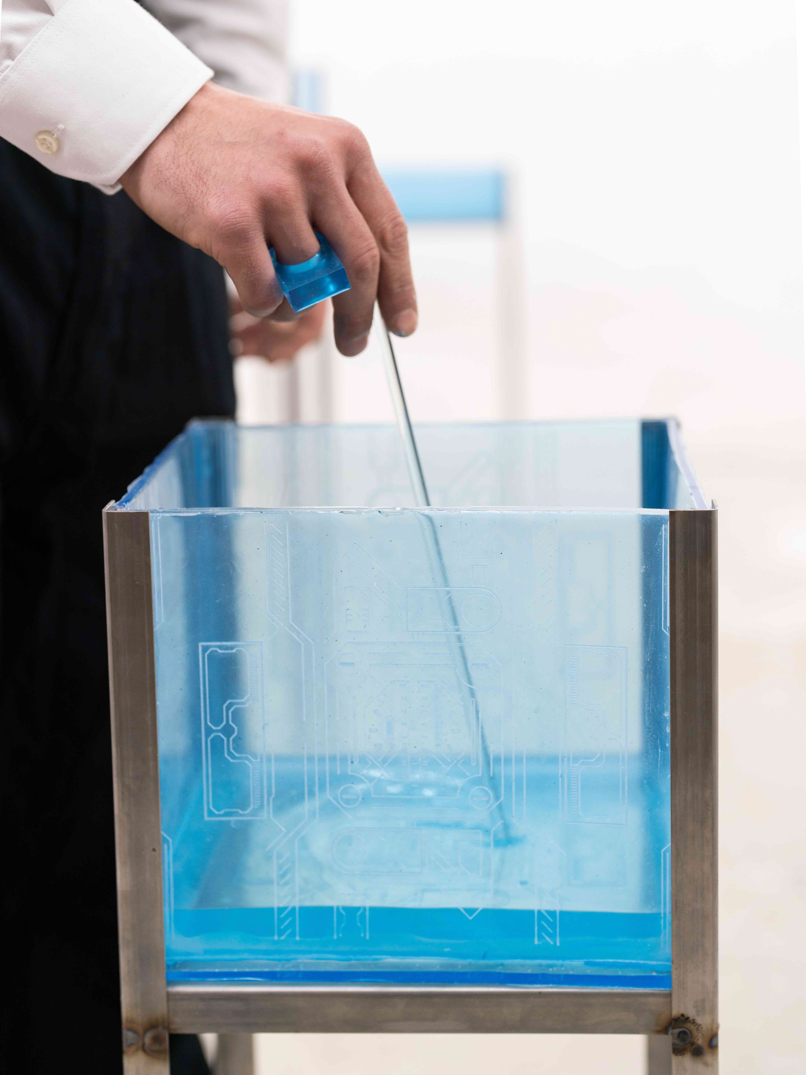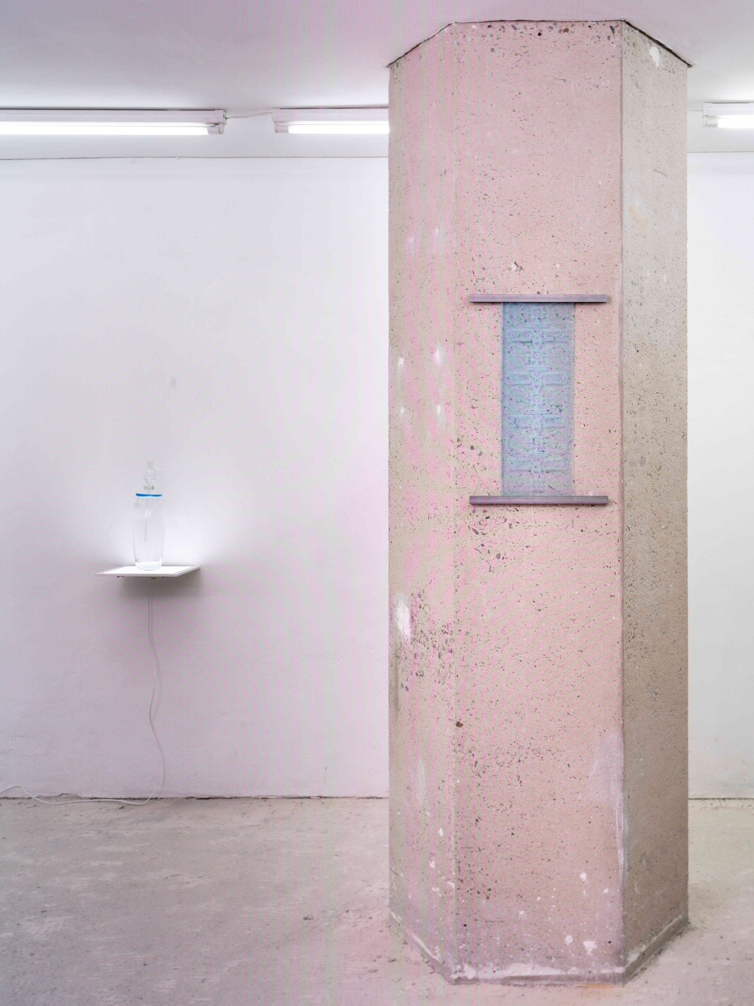 Nicht umsonst fühlt man sich an eine Laborsituation erinnert. In einer Ära der hedonistischen Selbstdarstellung und -optimierung, macht Constantin Hartenstein maschinelle und oft verborgene Prozesse sichtbar. In performativen Akten agiert während der Eröffnung ein Performer als Laborant und aktiviert erst die Flüssigkeiten.