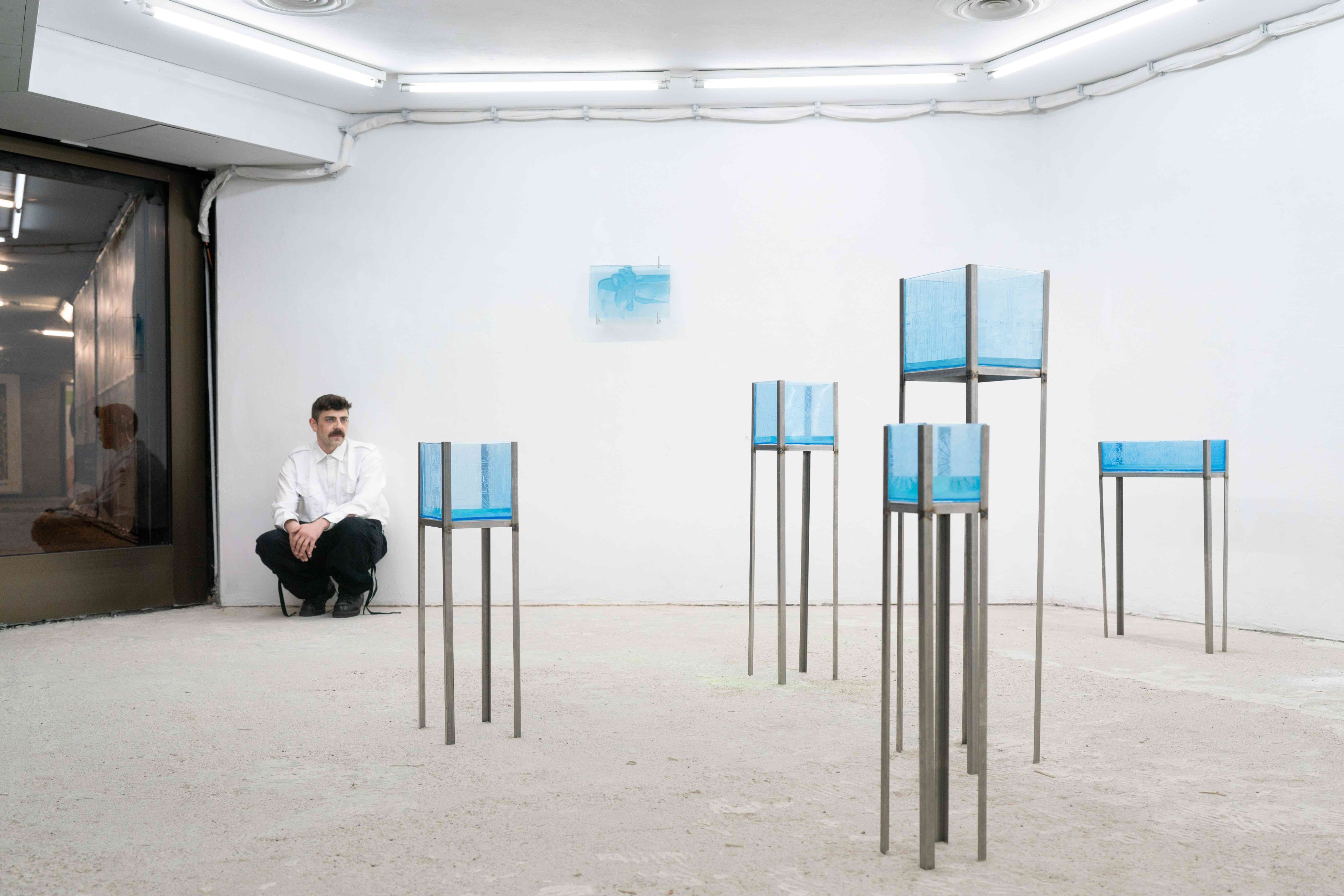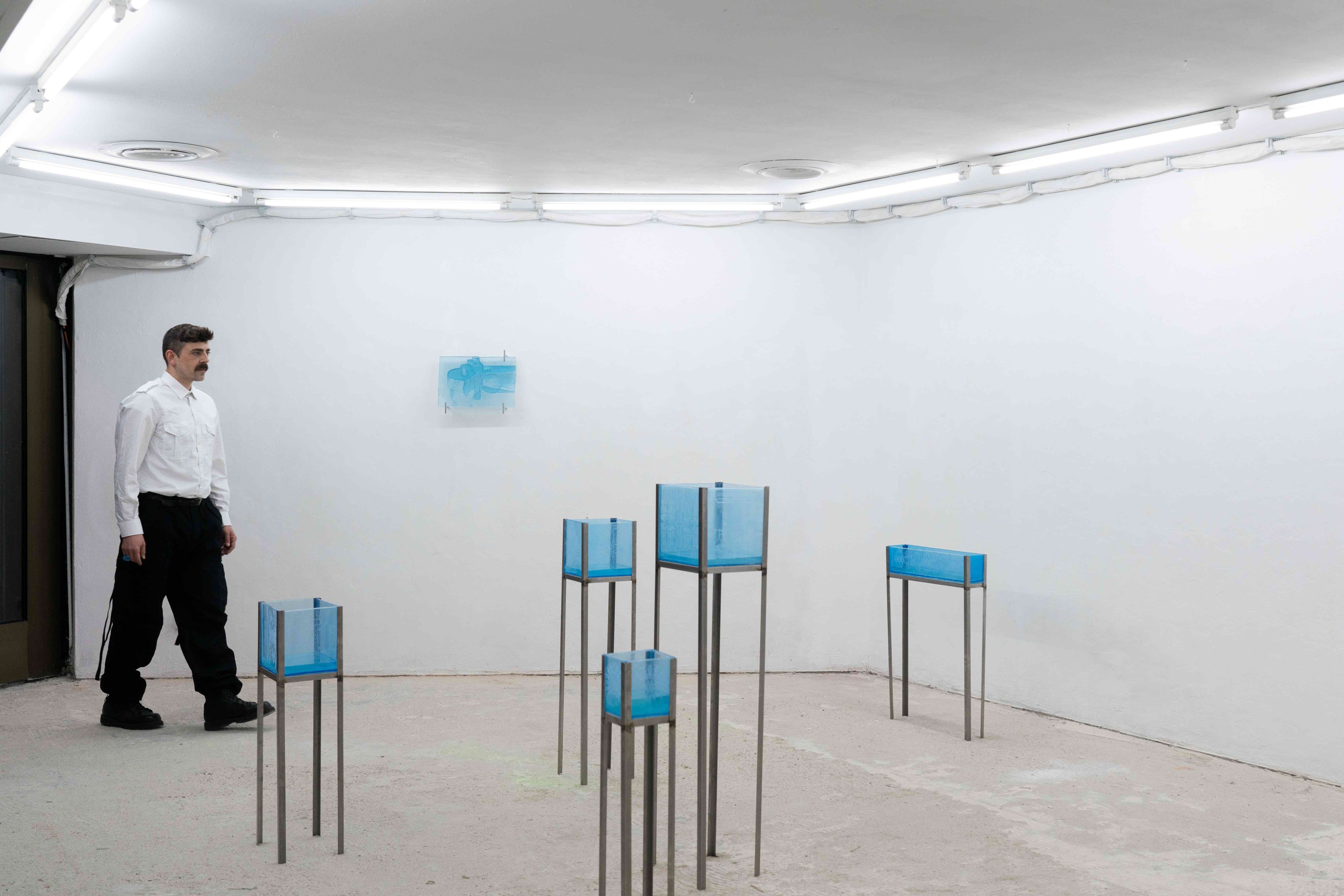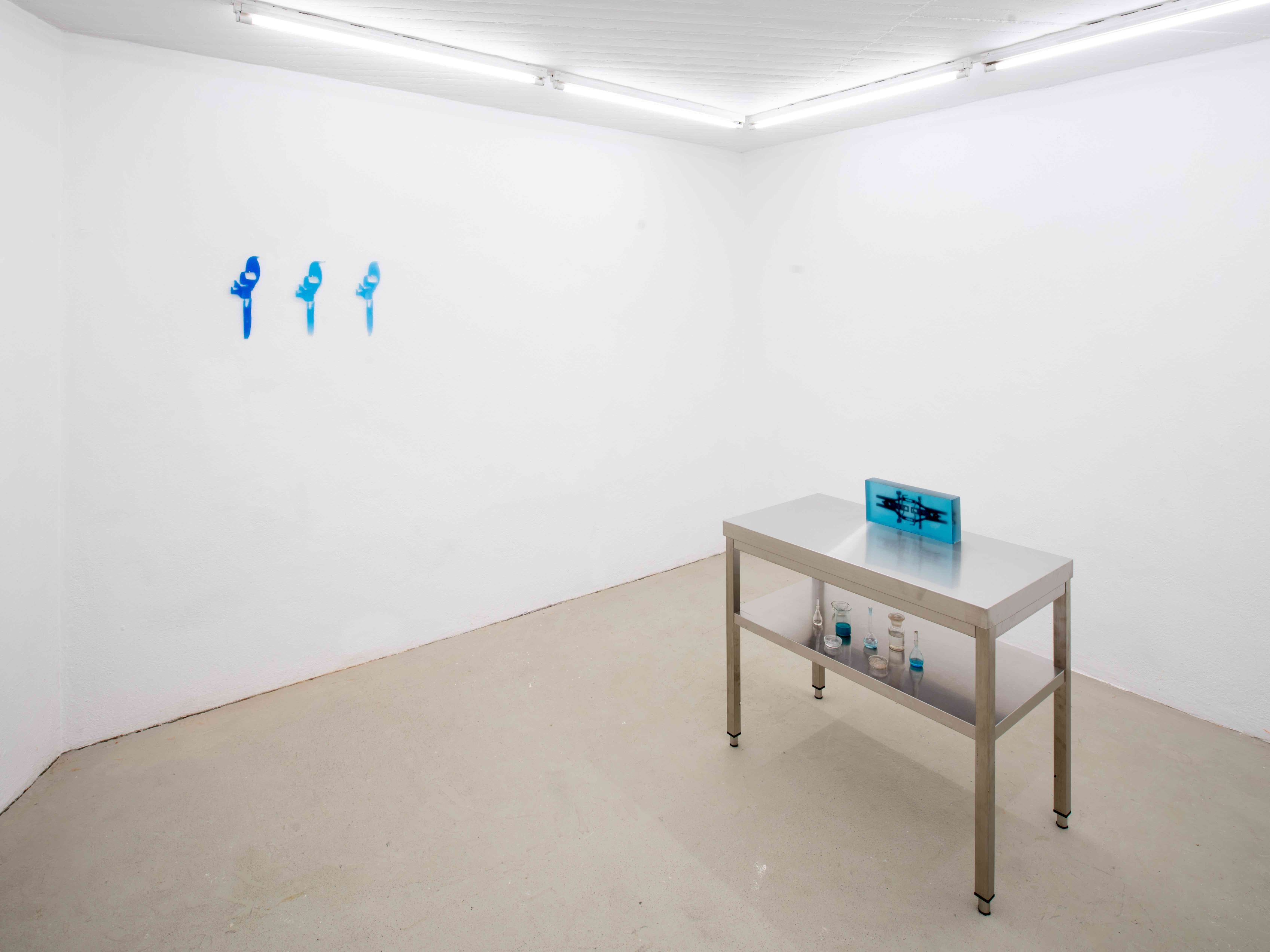 In unterschiedlich großen Bassins präsentiert der Künstler in den Räumlichkeiten von Mouches Volantes ein neues queeres Elixier. Dieses wurde u.a. aus Pheromonen, Künstler-Schweiss und aus symbolisch aufgeladenen Substanzen wie Gleit- & Testogel, Poppers oder G gewonnen. Einige dieser luziden Flüssigkeiten sind mit Algen angereichert und erhellen nachts geheimnisvoll das steril-kühle Setting. Die an den Wänden hängenden klinischen Wandreliefs bestehen zudem aus einer Mischung der Elixiere und aus bläulich schimmerndem Epoxidharz.