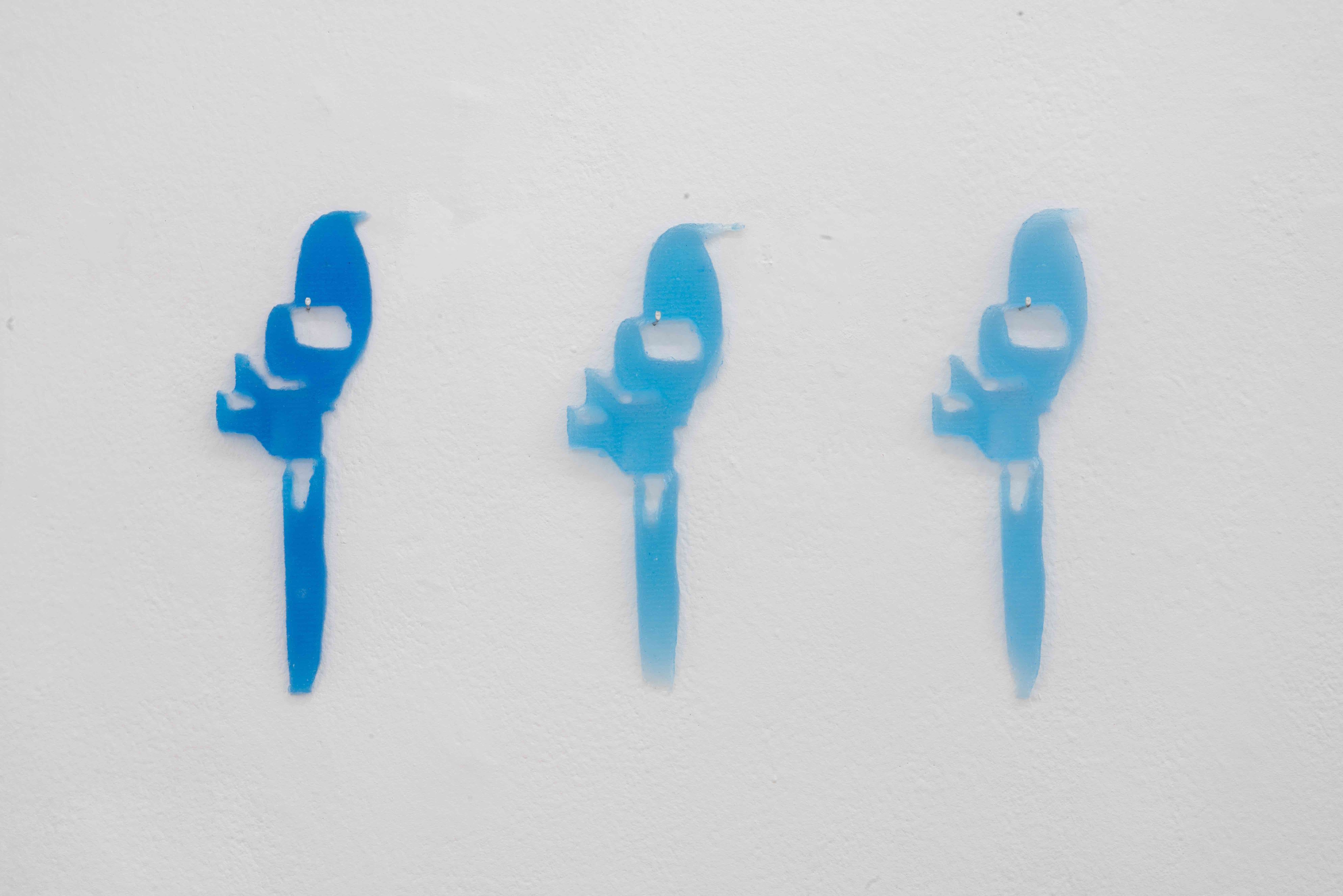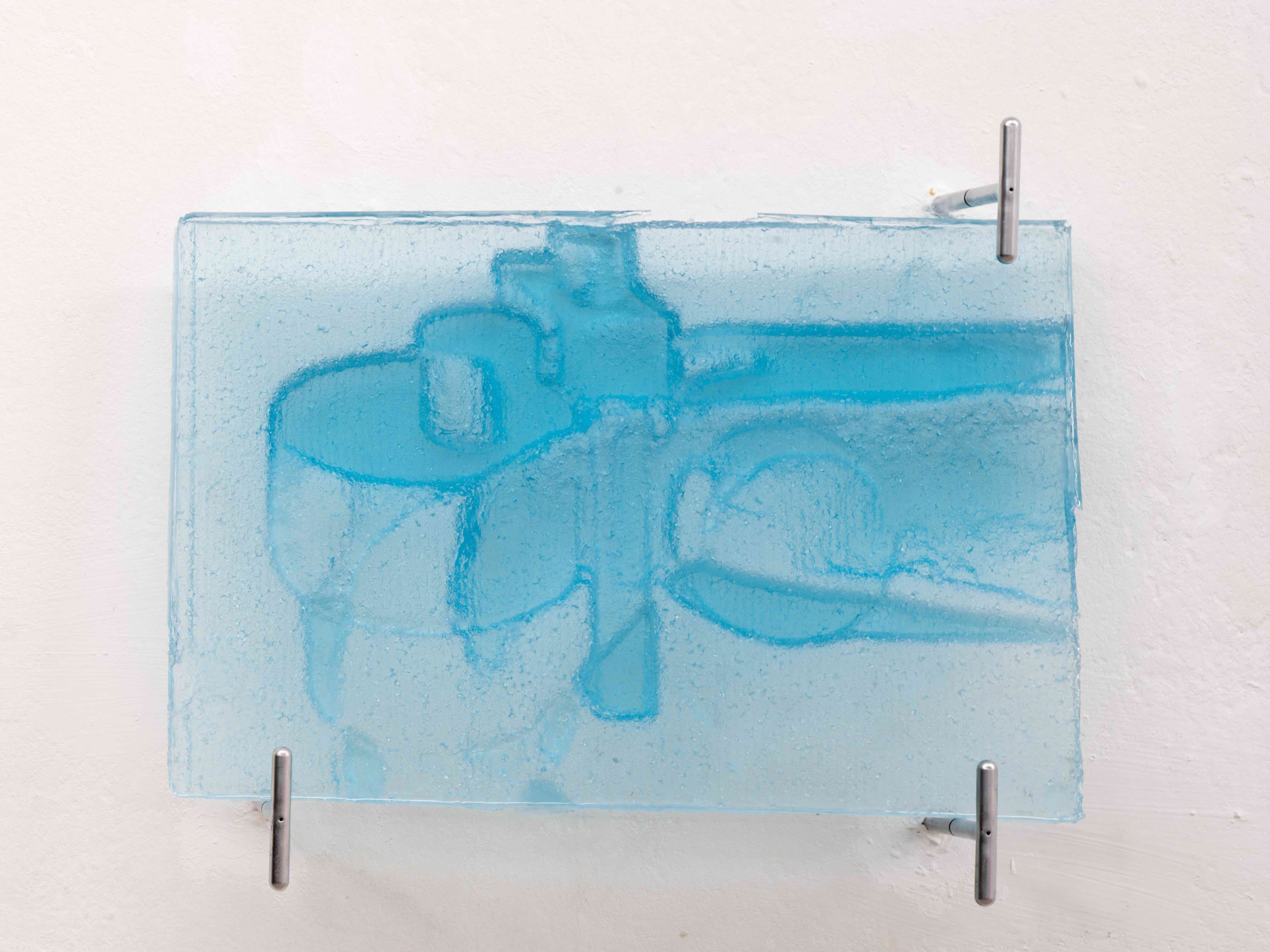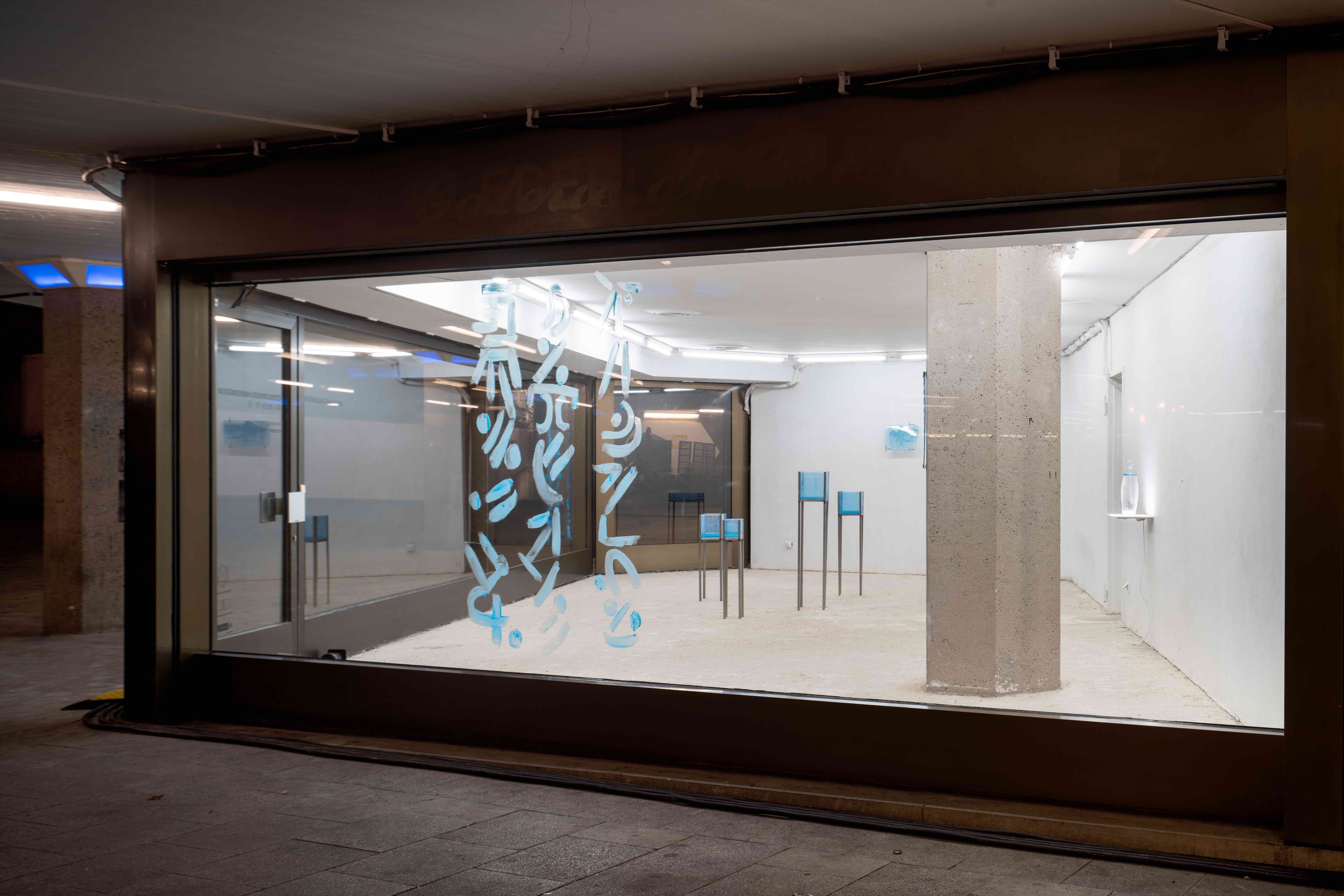 In unterschiedlich großen Bassins präsentiert der Künstler in den Räumlichkeiten von Mouches Volantes ein neues queeres Elixier. Dieses wurde u.a. aus Pheromonen, Künstler-Schweiss und aus symbolisch aufgeladenen Substanzen wie Gleit- & Testogel, Poppers oder G gewonnen. Einige dieser luziden Flüssigkeiten sind mit Algen angereichert und erhellen nachts geheimnisvoll das steril-kühle Setting. Die an den Wänden hängenden klinischen Wandreliefs bestehen zudem aus einer Mischung der Elixiere und aus bläulich schimmerndem Epoxidharz.